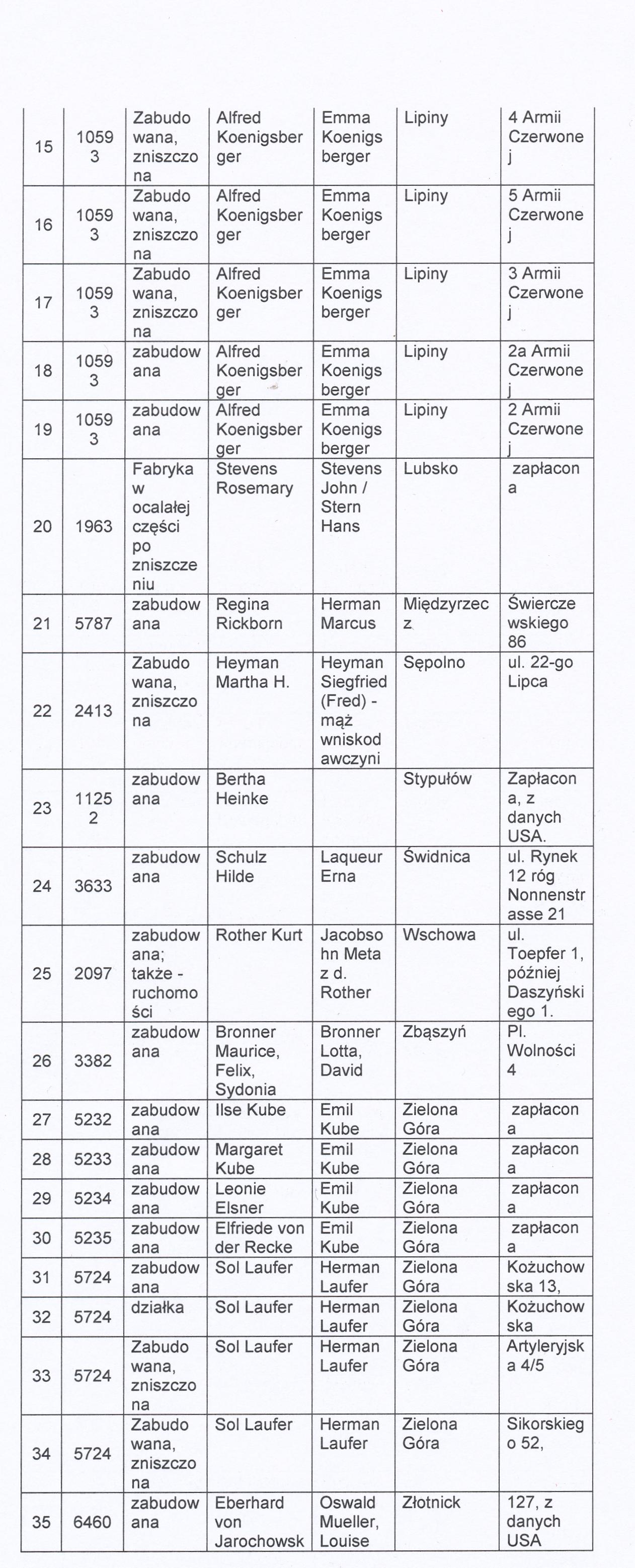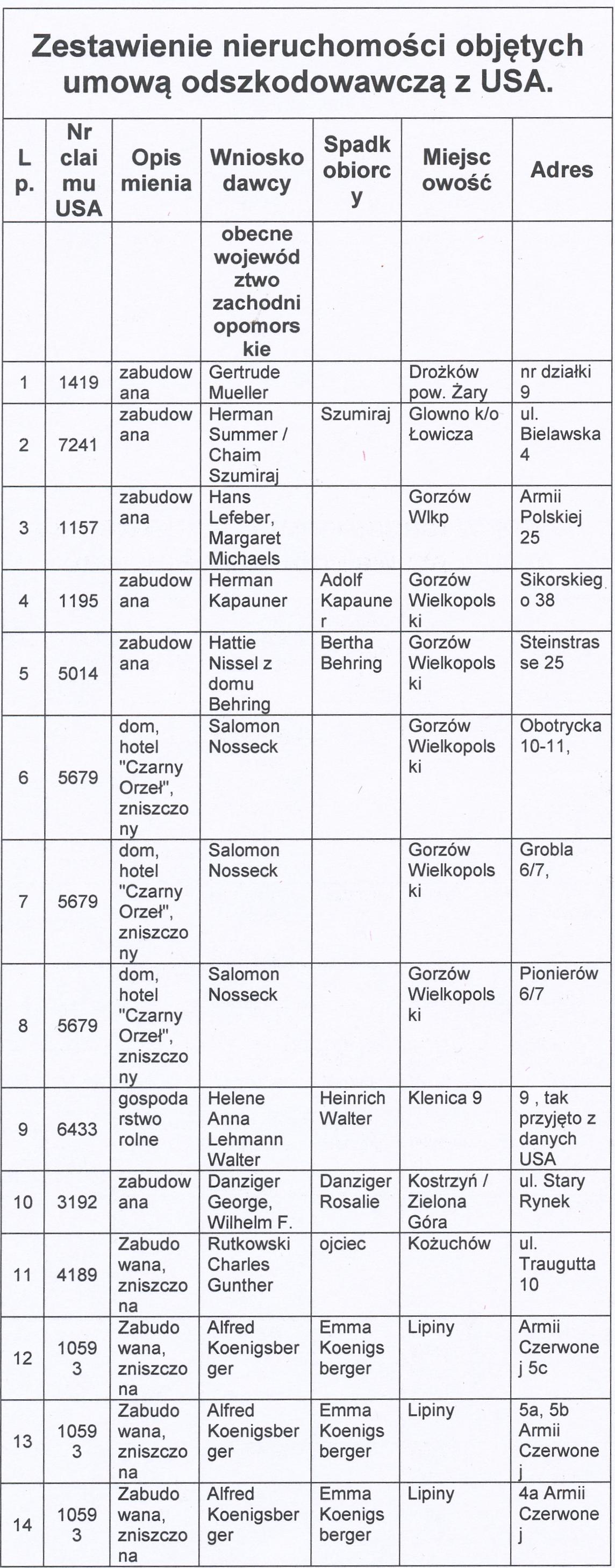 Dla uzupełnienia treści niniejszego mojego głosu proszę redakcję o zamieszczenie wykazu pozycji majątkowych ujętych w załączniku do polsko-amerykańskiej umowy odszkodowawczej, a wskazanych na terenie kilku obecnych województw odzyskanych od Niemiec Ziem Zachodnich. Za te wszystkie pozycje ujęte w przedłożonym wykazie, posiadające numerację amerykańską powojenna Polska Ludowa zapłaciła odszkodowanie rządowi Stanów Zjednoczonych. Wszystkie te pozycje stały się wyłączną własnością skarbu państwa i we wszelkiej ewidencji powinny mieć zapis o własności skarbu państwa.