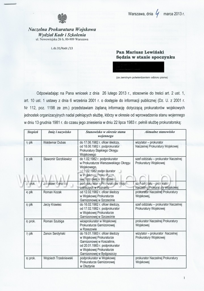 16 prokuratorów ze Stanu Wojennego – tak, dokładnie tych, którzy nie prośbą i groźbą, ale biciem, szantażem i więzieniem bronili ustroju socjalistycznego i występowali dzielnie w obronie dobrego imienia ZSRR i, w dalszej kolejności, PZPR i PRL- robi dzisiaj kariery w Naczelnej Prokuraturze Wojskowej. Czym się dzisiaj zajmują? W dużej części możecie to zobaczyć w […]w publikowanych poniżej dokumentach.