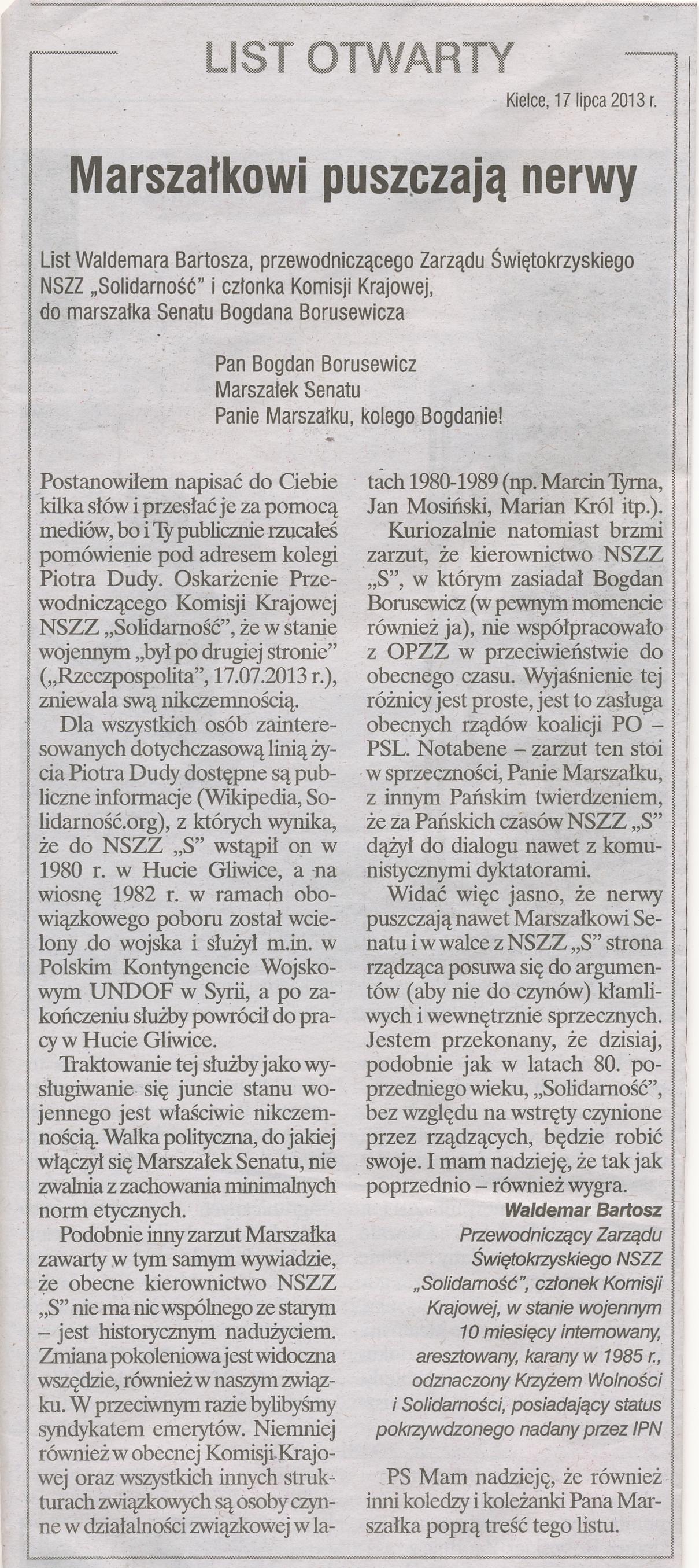 Marszałkowi puszczają nerwy- twierdzi w liście otwartym do marszałka senatu działacz Solidarności Waldemar Bartosz. Jest to normalne w sytuacji, gdy zaczyna być nerwowo, a wyborcy przymierzają się do powiedzenia-SPRAWDZAM.
