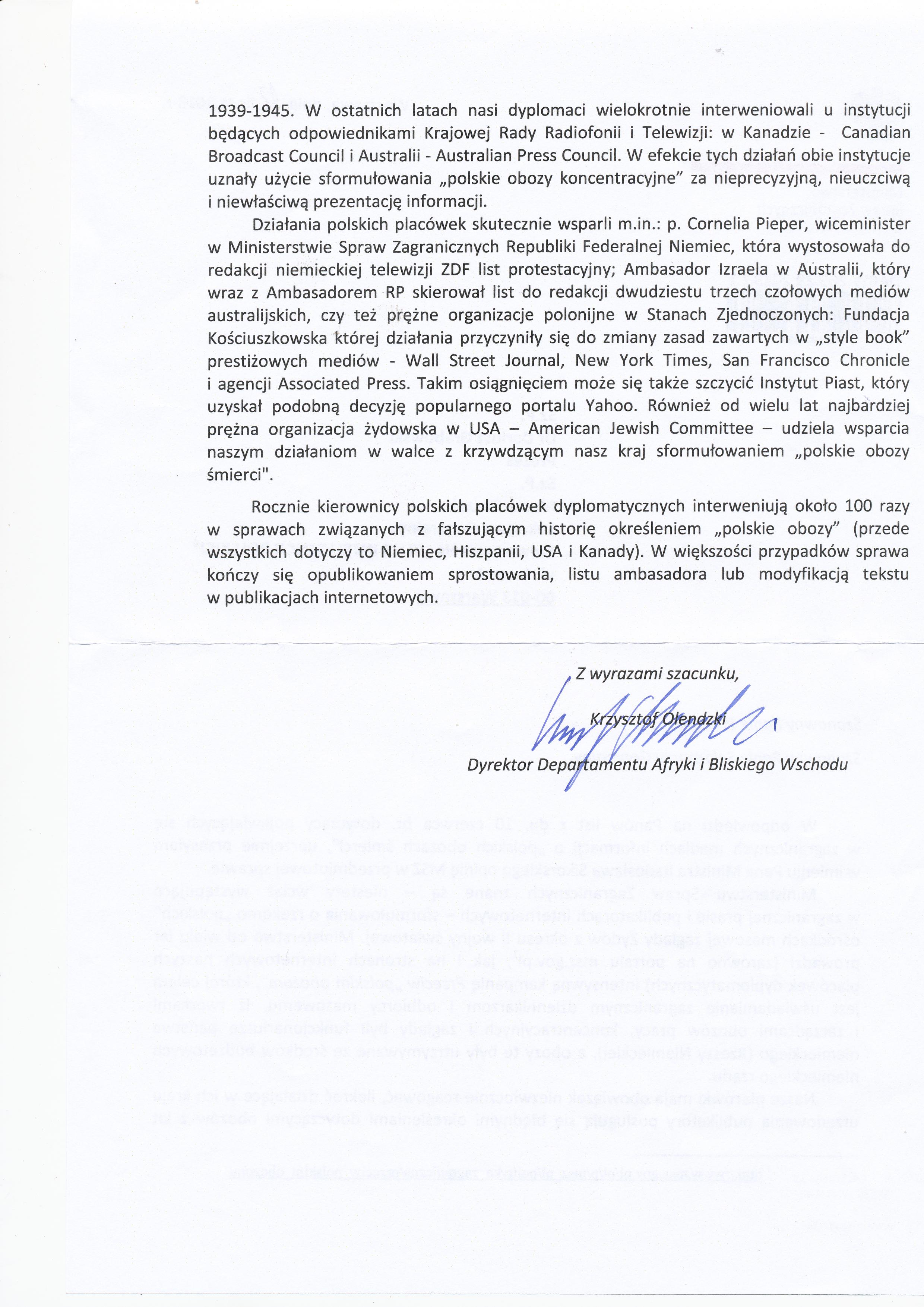 Odnotowujemy otrzymanie odpowiedzi na naszą interwencję. Oczekiwaliśmy jednak oprócz oceny i informowania nas o „wielkich” wysiłkach czynionych przez rodzimych dyplomatów, bardziej zdecydowanych kroków na rzecz przeproszenia naszego narodu za obraźliwe kłamstwa rzucane systematycznie przez określone środowiska na polskie społeczeństwo.