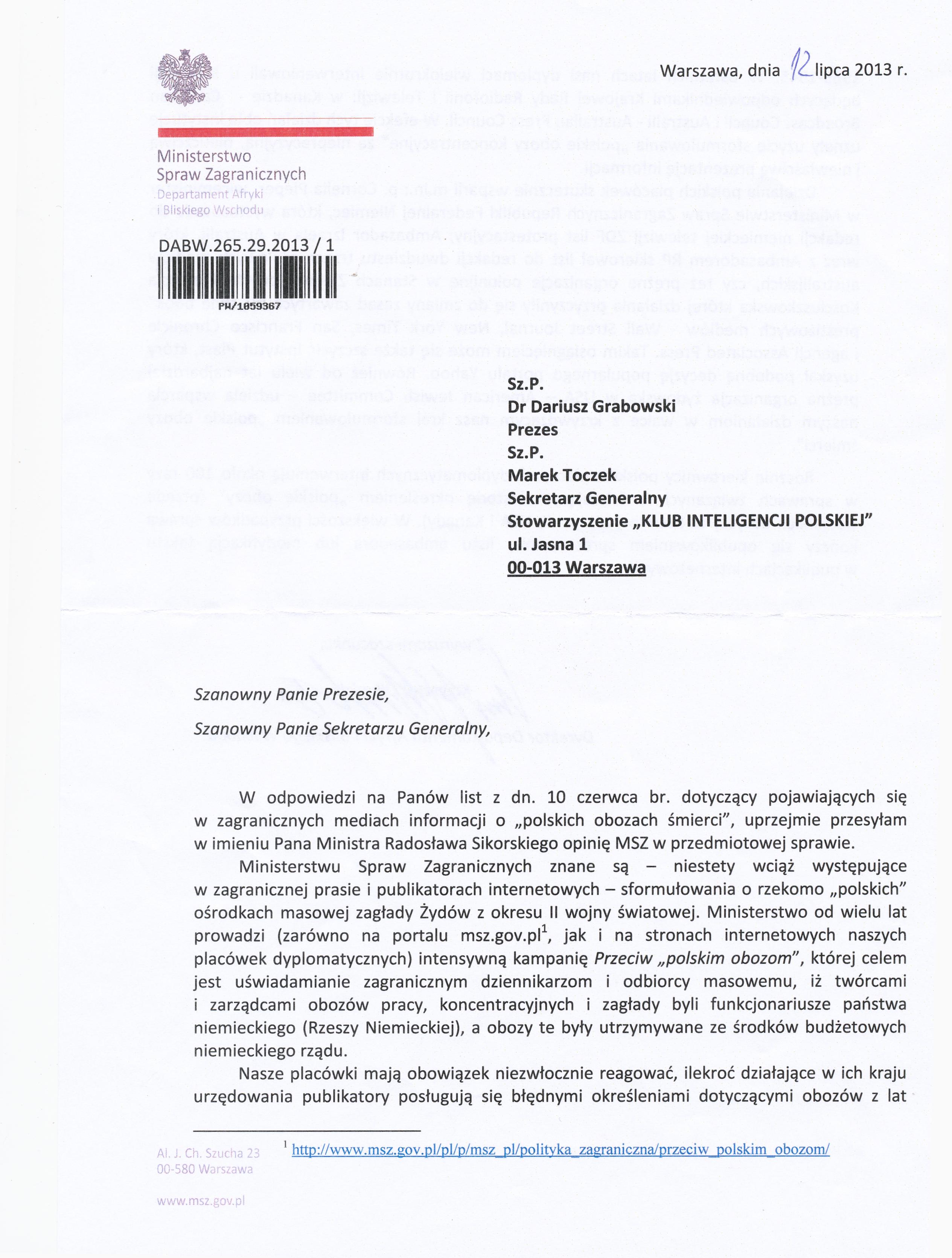 Ministerstwo Spraw Zagranicznych odpowiada na list Stowarzyszenia Klub Inteligencji Polskiej.
