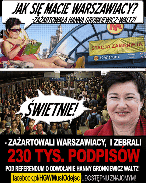 Powinniśmy mieć świadomość, że bez odwołania pani prezydent HGW nie będzie możliwe naruszenia tego politycznego układu i jak głoszą specjaliści, decydenci gotowi są do zastosowania każdego chwytu i tymi najbrudniejszymi włącznie. Grożenie przez premiera, że komisarzem Warszawy po referendum może zostać ponownie H.G.Waltz, jedynie potwierdza potrzebę naszej determinacji i powszechnego udziału w referendum.