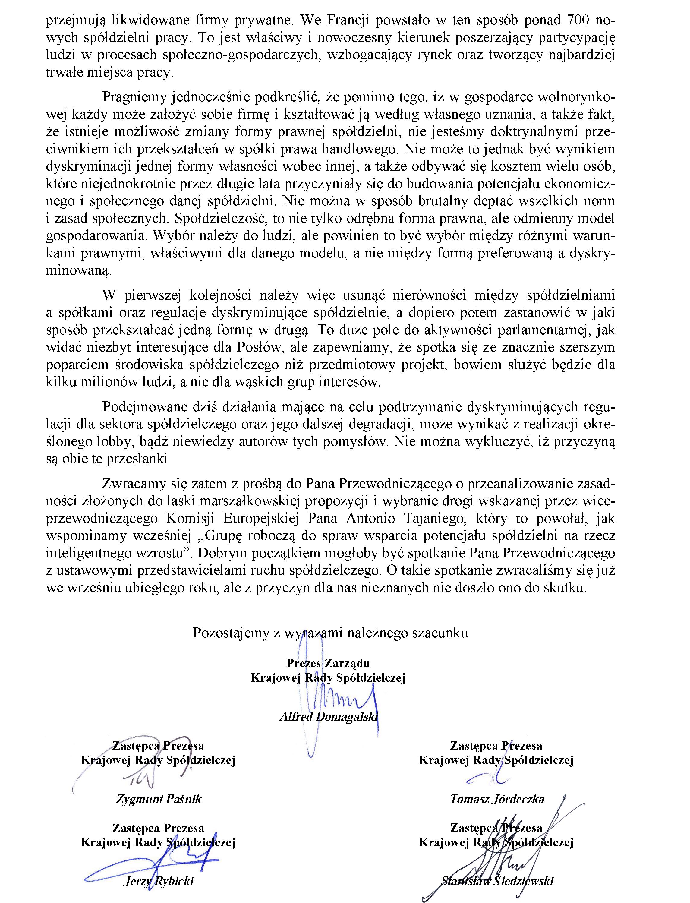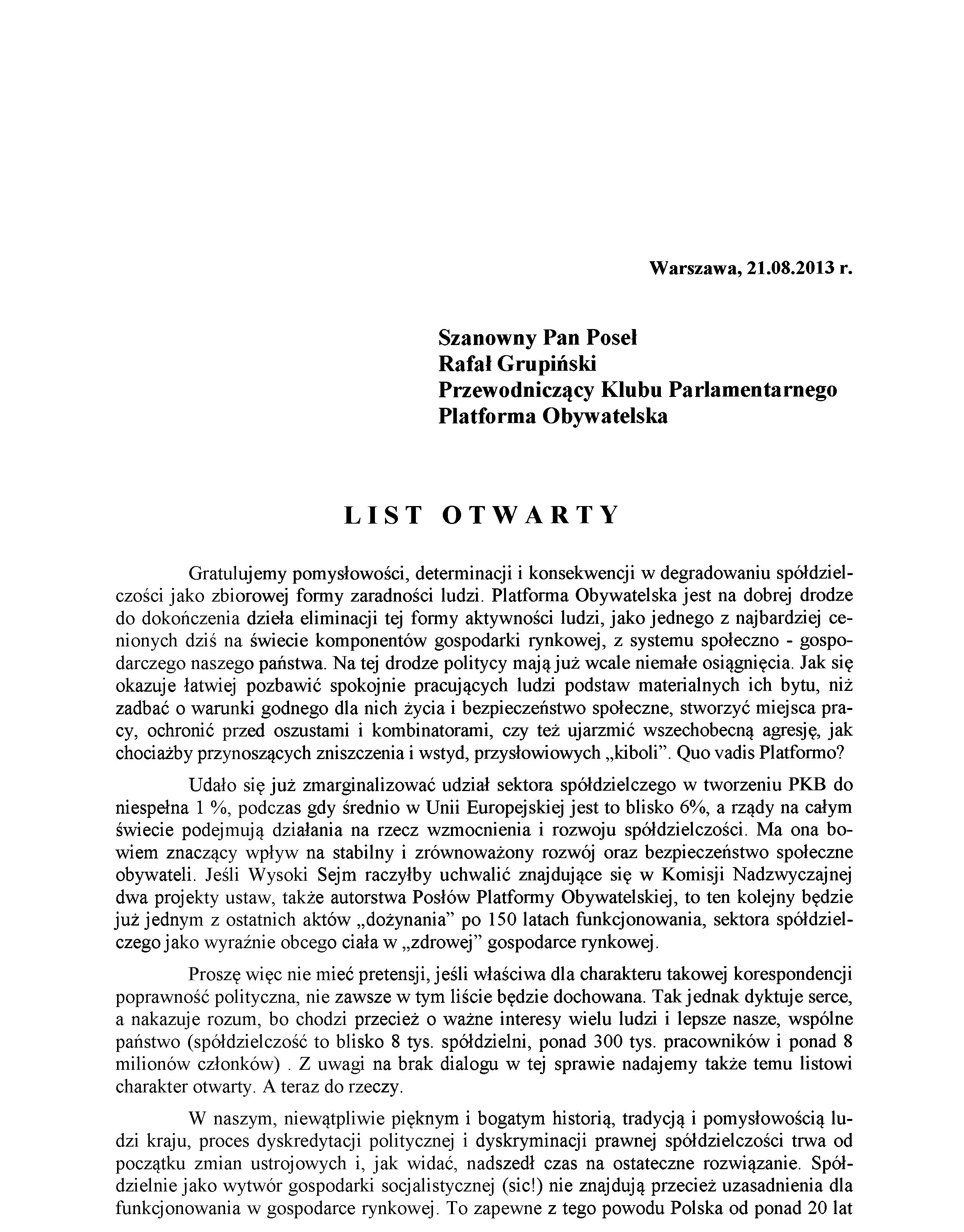 Spółdzielczość powstała blisko dwa wieki temu jako forma obrony zwykłych ludzi przed chciwymi i bogatymi. Wbrew propagandowym nieprawdziwym stereotypom, kojarzącym ją z zakładanymi pod przymusem w PRL –u kołchozami, nie była lubiana przez ówczesne władze i próbowano ją upaństwowić. Ale od rozpoczęcia transformacji w kapitalizm, także jest niewygodna dla ustroju ludzi bogatych oraz anonimowych obcych właścicieli i próbuje się ją zniszczyć. Jak wygląda niszczenie tej formy własności wspólnotowej zwykłych ludzi prezentuje poniższy List Otwarty Zarządu Krajowej Rady Spółdzielczej do Przewodniczącego Klubu Parlamentarnego Platformy Obywatelskiej.