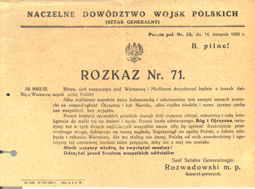 Bitwa nad Bugiem zaczęła się korzystnie dla Polaków, jednak po upadku Brześcia Piłsudski przerwał walki i powrócił do Warszawy, w samotności przygotowując koncepcję zwrotu zaczepnego odwracającego losy wojny. Jednocześnie generał Rozwadowski przygotowywał plan polegający na oderwaniu oddziałów od nieprzyjaciela i przegrupowaniu ich na linii Wisły. Równocześnie miano wyklinować odpowiednie rezerwy niezbędne do kontruderzenia. W nocy z 5 na 6 sierpnia Rozwadowski przedstawił Naczelnemu Wodzowi dwa warianty miejsc koncentracji, skąd miało wyjść kontrnatarcie. Pierwszy, ostrożniejszy, popierany przez gen. Weyganda zakładał uderzenie z okolic Karczewa w kierunku Mińska Mazowieckiego. Drugi, popierany przez szefa sztabu, przewidywał ograniczoną akcję manewrową, wychodzącą z okolic Garwolina, z równoczesnym uderzeniem wojsk wzmocnionego Frontu Północnego. Piłsudski zaakceptował drugie rozwiązanie. Podjęte decyzje znalazły swój wyraz w podpisanym przez Rozwadowskiego rozkazie do przegrupowania nr 8358/III. Wojna 1920 roku zakończyła się zwycięstwem Polaków. [Piłsudski 12 sierpnia składa na ręce premiera Witosa rezygnację z Naczelnika Państwa i opuszcza Warszawę. Dopiero 16 sierpnia widząc zwycięstwo wojsk polskich nad bolszewikami wraca, ale jak napisał w swych pamiętnikach, nie spotkał się z wojskami bolszewickim i nie nawiązał z nimi walki – TK]