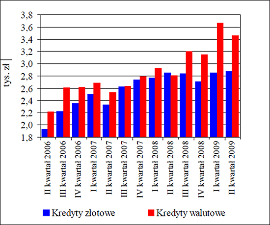 Oznacza to, że podaż tego niebezpiecznego produktu finansowego była tym większa im bardziej przewartościowany był PLN – większe było ryzyko nagłej zmiany w przeciwną stronę kursu walutowego CHF/PLN. Szczyt popularności kredytów zaciąganych we franku szwajcarskim przypadał na 2008 r. W III kwartale banki na każde 10 zł pożyczane na mieszkania niemal 7 zł udzielały w postaci kredytów frankowych.[21]