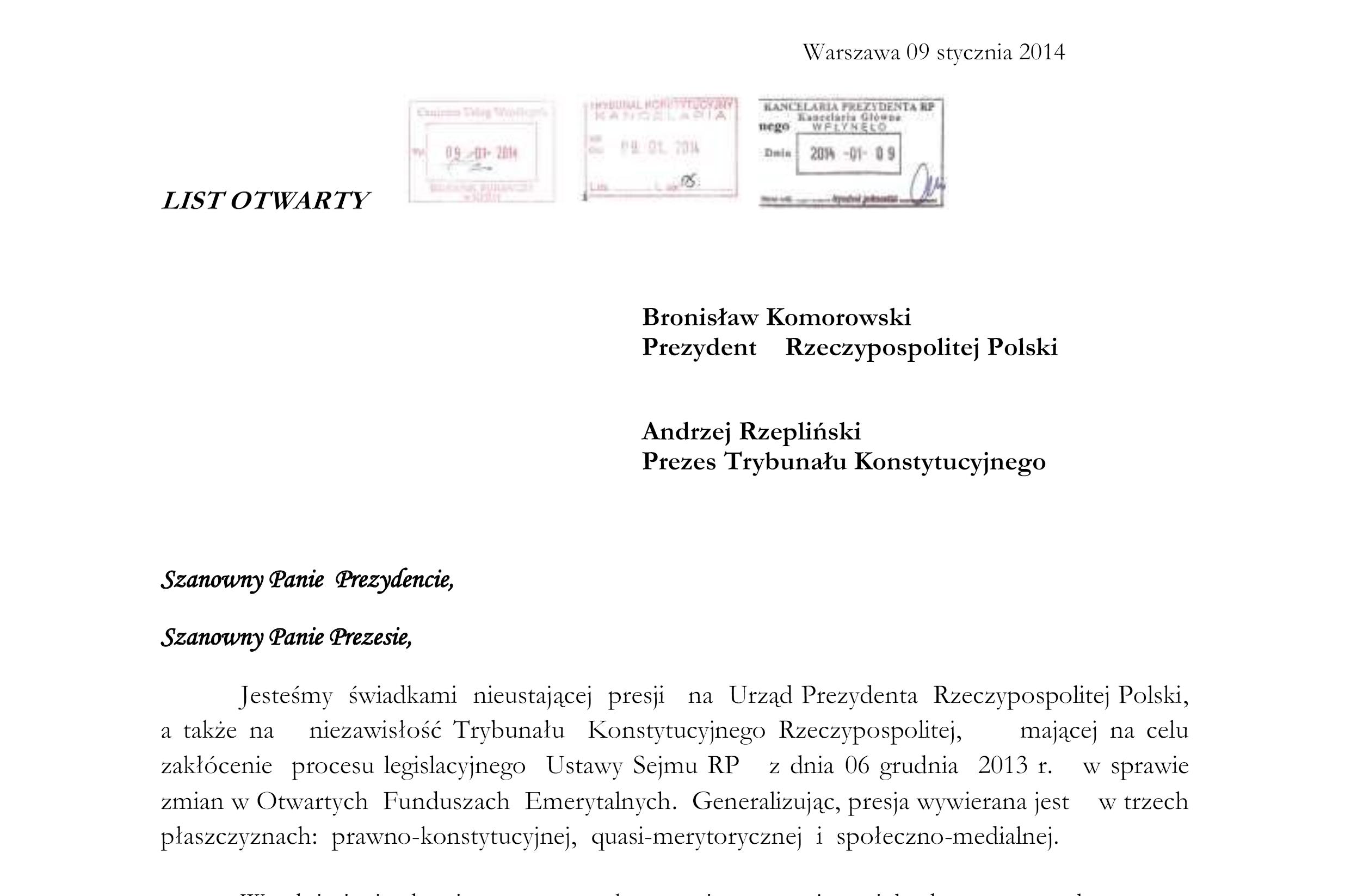“Do Kancelarii Prezydenta wpłynęły dwa dokumenty: List ekonomistów do Prezydenta RP oraz List prawników do Prezydenta RP. Sygnatariusze obydwu pism podkreślili, że forsowane przez rząd zmiany są szkodliwe.