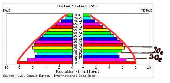 Na tej oficjalnej amerykańskiej statystyce wyraźnie widać „wcięcie” w rozkładzie wiekowym ludności tego „super” kraju, które rozpoczyna się w drugiej połowie lat 1920 i trwa przez następne dziesięciolecie. To jest dokładnie okres Wielkiej Depresji, kiedy to nagle stanęły warsztaty pracy i ponad milion tak zwanych „rodzinnych” gospodarstw farmerskich uległo likwidacji. W tym okresie głodu w USA (oczywiście przy zawalonych żywnością sklepach) nowe dzieci się nie rodziły, albo – jako najsłabsze – po prostu z głodu umierały. Oficjalnie ocenia się, że Stany Zjednoczone w tym okresie straciły, ponad przeciętną statystyczną, około 7 milionów ludności, przy czym możliwość „emigracji za chlebem” z USA była w tym okresie prawie żadna, bo i w Europie był Wielki Kryzys, który doprowadził do władzy demokratycznie wybranego Hitlera.