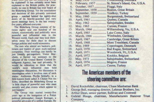 Twierdzi się, że Bilderberg wyreżyserował wyrzucenie Margaret Thatcher z Downing Strett, za jej opozycję wobec założenia superpaństwa europejskiego /…/ Mój Boże! Domostwa wydają się spać, a serca zostały uśpione!