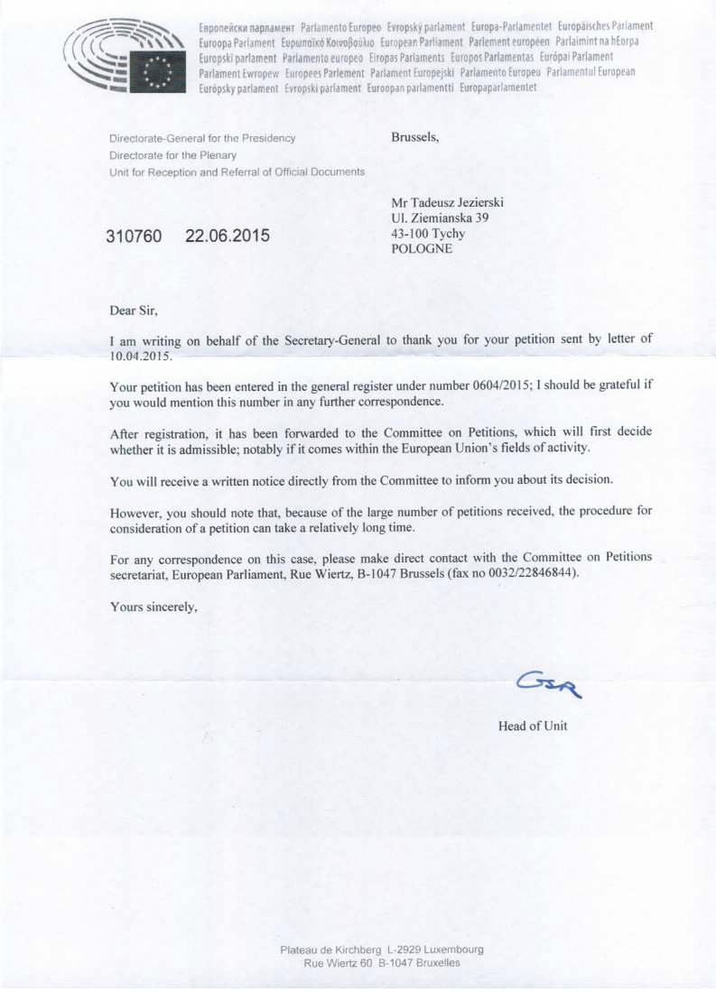 PS. od KIP. Odpowiedź Parlamentu Europejskiego, że poniższa Petycja będzie rozpatrywana przez Komisję PE została zamieszczona w oryginale i tłumaczeniu na końcu tekstu.
