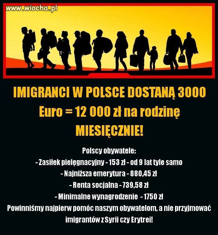 6. Władze Unii Europejskiej narzucają Polsce przyjęcie 150 tysięcy imigrantów z Bliskiego Wschodu i Afryki w tym roku, mimo że w Polsce przebywa około miliona imigrantów ekonomicznych z upadającej Ukrainy. Komisja Europejska domaga się od Polski zapewnienia zasiłków na osobę na poziomie krajów starej UE, który wynosi około 500 Euro, czyli ok. 2 tysiące złotych, a więc więcej niż wynosi w Polsce płaca minimalna. Doprowadzi to nieuchronnie do konfliktu dyskryminowanych dochodowo Polaków z uprzywilejowanymi imigrantami ekonomicznymi. Koszt roczny utrzymania przy tej wysokości zasiłku wyniesie 109,5 miliarda, a koszt budowy płotu na granicy zwrócił by się w ciągu niecałego dnia. Jeśli po negocjacjach ta kwota wyniesie połowę tego zasiłku w Polsce to i tak, będzie to kwota wybitnie dyskryminująca i upadlająca dla Polaków.