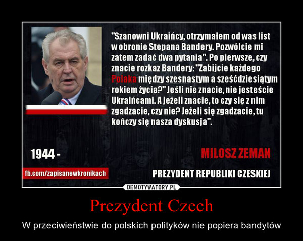 “Szanowni Ukraińcy, otrzymałem od was list w obronie Stepana Bandery. Pozwólcie mi zatem zadać dwa pytania” – rozpoczyna swój list Zeman. Dalej stawia sprawę jasno: “Po pierwsze, czy znacie rozkaz Bandery: “Zabijcie każdego Polaka między szesnastym a sześćdziesiątym rokiem życia?” Jeśli nie znacie, nie jesteście Ukraińcami. A jeżeli znacie, to czy się z nim zgadzacie, czy nie?” – pyta prezydent Czech. “Jeżeli się zgadzacie, tu kończy się nasza dyskusja” – czytamy.