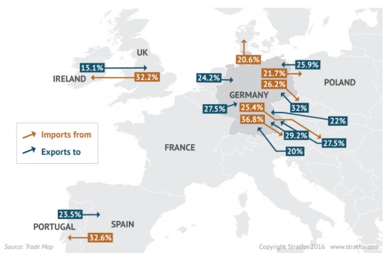 Niemiecki wpływ na Europę ma nie tylko geopolityczny charakter. Duża część tego wpływu opiera się na handlu. W szczególności ostatnie 20 lat były czasem, w którym Niemcy stały się silną, międzynarodową fabryką dóbr. Niemcy importują półprodukty od swoich sąsiadów (w przypadku 8 sąsiadujących z Niemcami krajów ponad 20 proc. ich eksportu trafia do Niemiec), a następnie składają z nich wyrafinowane i przetworzone dobra końcowe. W 2014 roku Niemcy były pierwszym kierunkiem eksportowym w przypadku 14 z 27 krajów UE oraz pierwszym partnerem jeśli chodzi o import w przypadku 15 z nich.