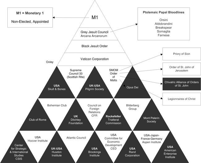 Podsumowaniem i rozwinięciem analizy materiałów: poniższego i załączonych, przez ludzi dociekliwych i mających odwagę myśleć samodzielnie, jest załączony powyżej schemat ( chociaż niepełny) struktury piramidy globalnej władzy.