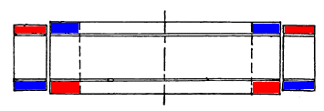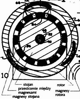 Ważne są łukowato wygięte magnesy rotora o ostrych krawędziach, ogniskujące siły magnetyczne, trochę dłuższe niż łączna długość dwóch magnesów stojana i przestrzeni między nimi. Magnesy stojana są zwrócone biegunami N do góry i umieszczone na materiale o wysokiej przenikalności magnetycznej. Rotor od stojana odległy jest o 9,5mm. Regulacja prędkości odbywa się przez wsuwanie i wysuwanie rotora ze stojana.