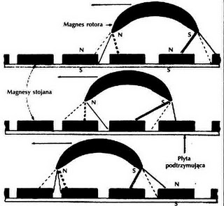 Hovard Johnson pomyślał, że skoro dwa bieguny magnesu się przyciągają lub odpychają, to powstałe siły można by użyć do napędu. I wymyślił silnik napędzany samą tylko energią stałych magnesów, bez dostarczania z zewnątrz jakiejkolwiek [znanej ówcześnie] energii (rys.1):