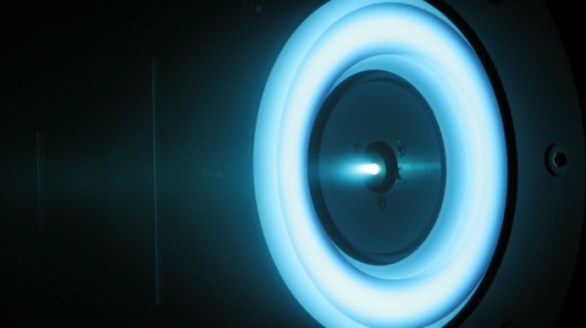 Zdjęcie powyżej przedstawia najnowszy jonowy silnik, wyprodukowany w centrum badawczym NASA – Jet Propulsion Laboratory. Zostało zrobione przez iluminator w komorze próżniowej, gdzie trwają badania nad silnikami tego typu.