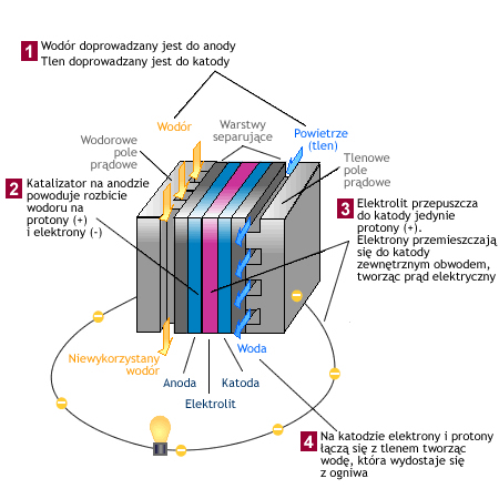 Ogniwa paliwowe są urządzeniami elektrochemicznymi, które wytwarzają energię użyteczną (elektryczność, ciepło) w wyniku reakcji chemicznej wodoru z tlenem. Produketm ubocznym jest woda.