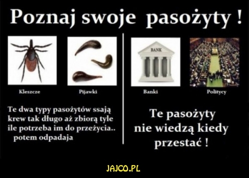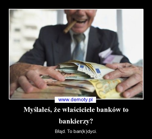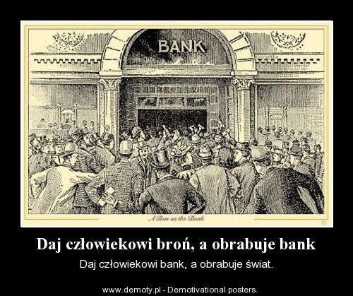 „Gdyby zwykły człowiek zaczął drukować pieniądze i puszczać je do obiegu – to byłby przestępcą. A w sytuacji gdyby te pieniądze pożyczał jeszcze na procent i inkasował dodatkowo procenty, to byłby przestępcą do kwadratu. Natomiast gdyby jeszcze za niespłacone należności: kapitału, odsetek, prowizji i innych wydumanych kosztów, przejmował majątek od dłużników i sprzedawał za 1/3 – ½ wartości, obciążając pozostałym długiem kredytobiorcę/pożyczkobiorcę, a nawet jego następne pokolenia – to byłby kosmicznym przestępcą do n-tej potęgi. A gdy to samo robią instytucje całego systemu bankowego, to nie tylko jest to legalne, ale jeszcze rządzący, nauka, edukacja i media nazywają je „instytucjami zaufania publicznego”. Czy można sobie wyobrazić większy szczyt bezczelności ? Chyba nie”. ( za: https://www.klubinteligencjipolskiej.pl/2015/10/rugi-polakow-z-majatku-za-pomoca-przemocy-finansowo-prawnej-i-immunitetow-bezprawia/ )