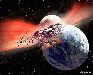 Ziemia w wyniku zderzenia została zepchnięta na niższą, dzisiejszą orbitę i zaczęła leczyć ogromną ranę. Można sobie wyobrazić, jak wyglądała – wielkie, potężnie nadgryzione jabłko, obracające się w ciągłych wstrząsach powodowanych brakiem stabilności. Woda z powierzchni, zalewając potężną „ranę” trafiała w obszar wysokiej temperatury, która powodowała wytworzenie wielkiej ilości pary wodnej, zaczynając tworzenie pierwszej atmosfery. Czy to ten fakt jest naukowym „wielkim odgazowaniem”? Czy to dopiero wtedy zaczęła tworzyć się pierwsza słodka woda, podstawa do rozwoju życia na lądach?