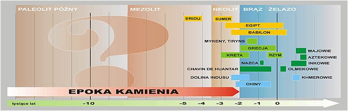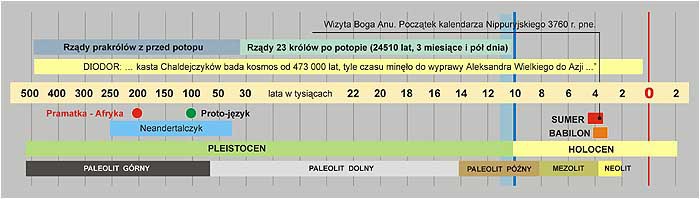 Po to by choć częściowo uprzytomnić sobie czas o jakim mówimy, stworzyłem własną chronologię tamtych epok, opierając się na relacjach starożytnych i czasem dzisiejszej nauki, ale tylko dla „naszych” terenów bez uwzględniania przekazów hinduskich i amerykańskich. Jak można zauważyć w dzisiejszej nauce występuje konflikt, który można nazwać „obsesją liczb”. Astronomowie, geologowie czy paleontologowie operują z rozmachem milionami i miliardami lat, podczas gdy współczesnym historykom do opisania naszej historii wystarczą tylko tysiące, a liczba 10000 podobnie jak u starożytnych Greków znaczy niewyobrażalne mnóstwo. Jedni chcą „rozciągnąć” historię, drudzy namiętnie ją „ściskają”. Jest to efekt datowania najmłodszych wiekiem artefaktów i szczątków organicznych należących tylko do cywilizacji ludzi, do potomków tych, co ocaleli po ostatnim wielkim kataklizmie oraz próba przypisania im wszystkiego co tylko odnaleziono, a czego nie wykonali.