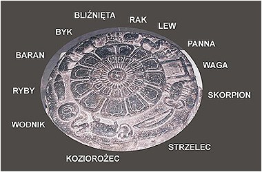 I jeszcze ciekawostka. W Indiach znaleziono wyrzeźbiony w kamieniu krąg znaków Zodiaku. Po prawej zaznaczyłem nasze nazwy i w zasadzie większość z nich zgadza się z wyrytymi rysunkami. Oznacza to, że zodiakalny zwierzyniec był jednakowy dla całego świata, choć zapewne różnił się nazwami. Zaznaczeni na obrzeżu jeźdźcy wskazują kierunek przesuwania się osi Ziemi na tle gwiazdozbiorów w ruchu precesyjnym.