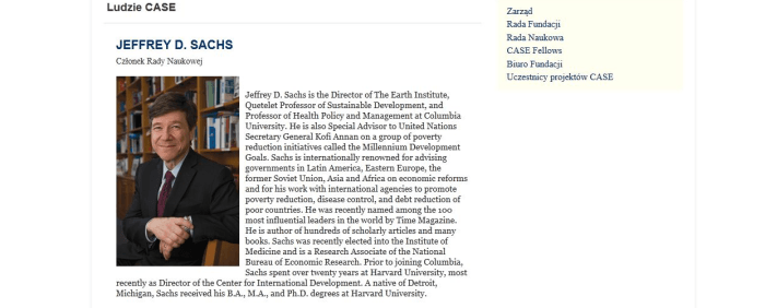 Jednym z członków rady fundacji CASE jest rzecz jasna … Leszek Balcerowicz. Ale jak zapewne wszyscy zorientowani w tematach związanych z Balcerowiczem wiedzą, że w jego otoczeniu zawsze gdzieś czai się jeden z najważniejszych obecnie ludzi na świecie a więc George Soros. I tak jest również i w tym przypadku. Jak można przeczytać na stronie CASE członkiem rady naukowej tej fundacji jest Jeffrey Sachs, protegowany Sorosa, który z jego polecenia napisał dla Polski na przełomie lat 80-tych i 90-tych w ciągu jednej nocy kompletny program transformacji z ustroju socjalistycznego na kapitalistyczny.