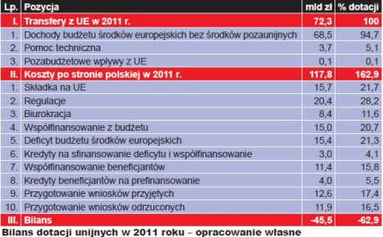 Programy przedakcesyjne UE dla Polski (PHARE, ISPA, SAPARD) wg rządowych stron internetowych Ministerstw: Gospodarki, Finansów, Środowiska, wg danych statystycznych, publikacji prasowych 1999 – 2003, pokazują, że zaakceptowane do rozliczenia wydatki inwestorów nie przekroczyły ogółem kilku procent kwot przyznanych Polsce. Pytanie, kto do kogo dopłaca jest więc czysto retoryczne. Jeżeli uwzględnimy jeszcze fakt, że kwoty, które przyznaje UE nie powinny przekraczać 1% PKB i odliczymy od nich nasze składki, to absurd tej akcesji staje się nie możliwy do pojęcia dla normalnego człowieka.