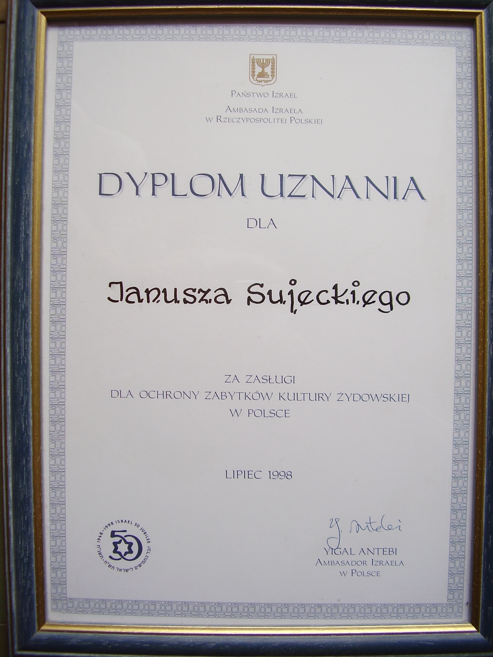 Janusz Sujecki otrzymał w 1998 roku z rąk ówczesnego ambasadora Izraela w Polsce Yigala Antebiego dyplom uznania za „zasługi dla ochrony zabytków kultury żydowskiej w Polsce”. Jak dowiedział się nasz portal, Sujecki postanowił zwrócić wyróżnienie na ręce Anny Azari – obecnej ambasador. Jak tłumaczy, ma to związek z „haniebnym atakiem” Izraela przeciwko Polsce.