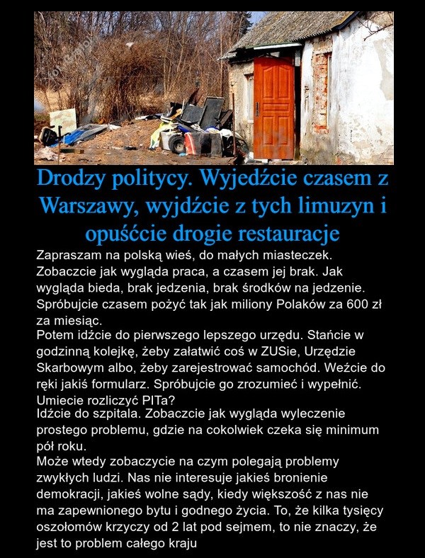 „Drodzy politycy. Wyjedźcie czasem z Warszawy, wyjdźcie z tych limuzyn i opuśćcie drogie restauracje.”