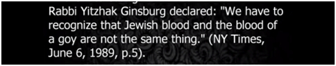 Rabin Yitzhak Ginsburg zadeklarował: „Musimy uznać to, że żydowska krew i krew Goja nie są takie same”. (NY Times, 6.06.1989, s. 5)