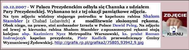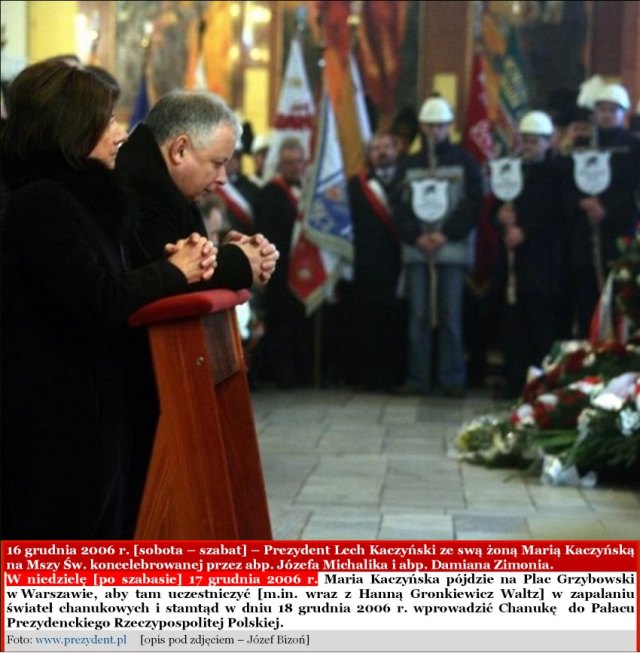 Prezydent Lech Kaczyński wraz ze swą małżonką Marią Kaczyńską oraz 94 osobami na pokładzie samolotu Tu-154 zginął pod Smoleńskiem udając się na groby pomordowanych w kwietniu 1940 r. w Katyniu przez NKWD Stalina oficerów polskich sił zbrojnych II Rzeczypospolitej. Wcześniej samolot pełen fotoreporterów wylądował na smoleńskim lotnisku. Po nim rozbił się samolot z prezydentem Lechem Kaczyńskim na pokładzie. Zginął wówczas również ks. Roman Indrzejczyk, który 15 grudnia 2007 r. wraz z abp Kazimierzem Nyczem Metropolitą Warszawskim, prezydentem Lechem Kaczyńskim i jego żoną Marią, Michaelem Schudrichem, Piotrem Kadlcik, Dawidem Peleg ambasadorem Izraela w Polsce, przedstawicielami społeczności żydowskich, żydowskimi dziećmi, zapalał menorę w Pałacu Prezydenckim. Rabini, którzy przy takich okazjach są zawsze wszędzie widoczni przy przedstawicielach władz Polski, nie udali się w tym dniu na uroczystości w Katyniu – była to sobota i był to czas szabatu.