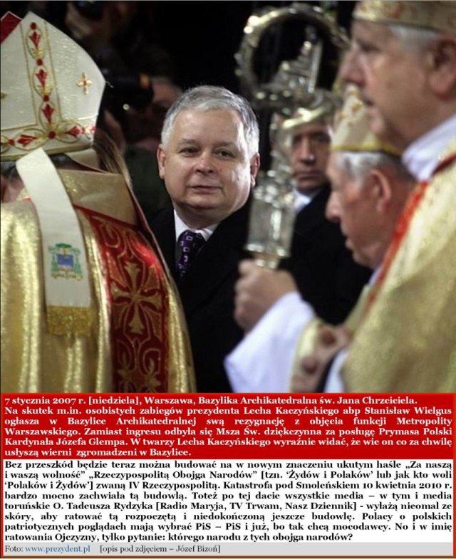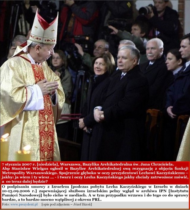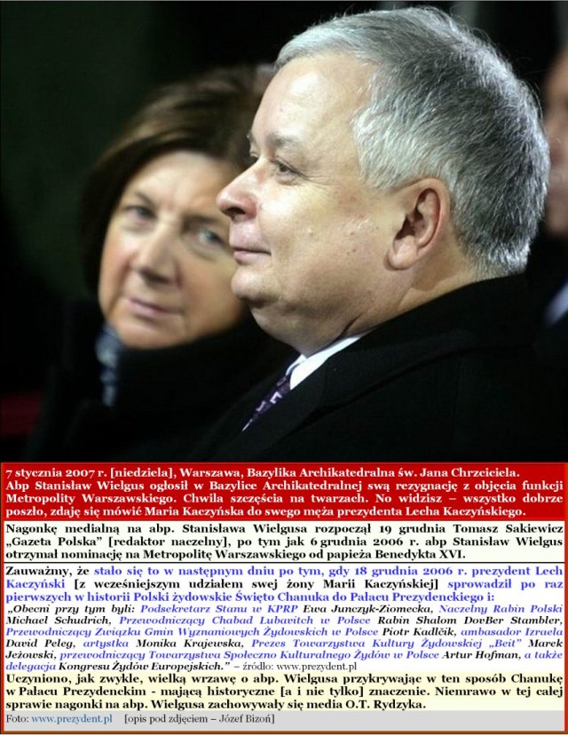 Wrzawa powstała wówczas wielka – a rozpoczęła ją ‚Gazeta Polska’. Jednak i z tym problemem poradził sobie [wraz innymi pomagierami] prezydent Lech Kaczyński – nie ukrywając swej radości klaszcząc dłońmi [pomiędzy rozwartymi swymi kolanami], gdy 7 stycznia 2007 r. ks. abp Stanisław Wielgus na niedoszłym swoim ingresie złożył rezygnację z funkcji Metropolity Warszawskiego.