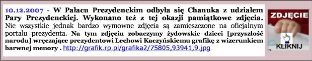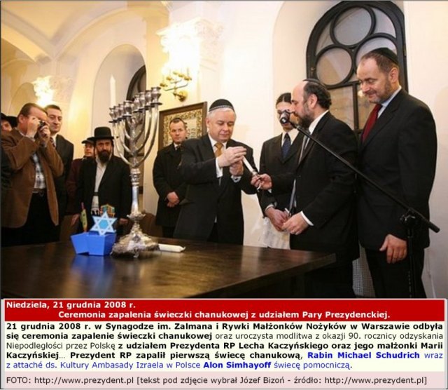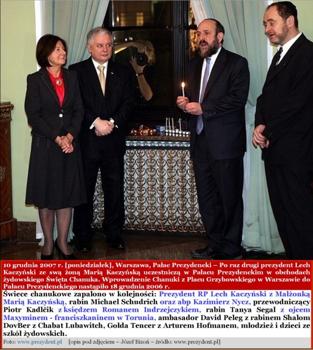 Po owocnych obradach, wykładach roku 2004 i 2005 w Fundacji Stefana Batorego George’a Sorosa – żydowskiego ‚filantropa’, po wymianie premiera Kazimierza Marcinkiewicza na premiera Jarosława Kaczyńskiego [14 lipca 2006 r.] i po owocnej wizycie prezydenta Lecha Kaczyńskiego w Izraelu w dniach 10-13 września 2006 r. [podczas której m.in. zapewniono stronie izraelskiej wgląd do archiwów IPN] nastał czas na stałe wprowadzenie do Pałacu Prezydenckiego żydowskiego święta Chanuki – no i przy tej okazji menory [jako świecznika pod świece chanukowe].