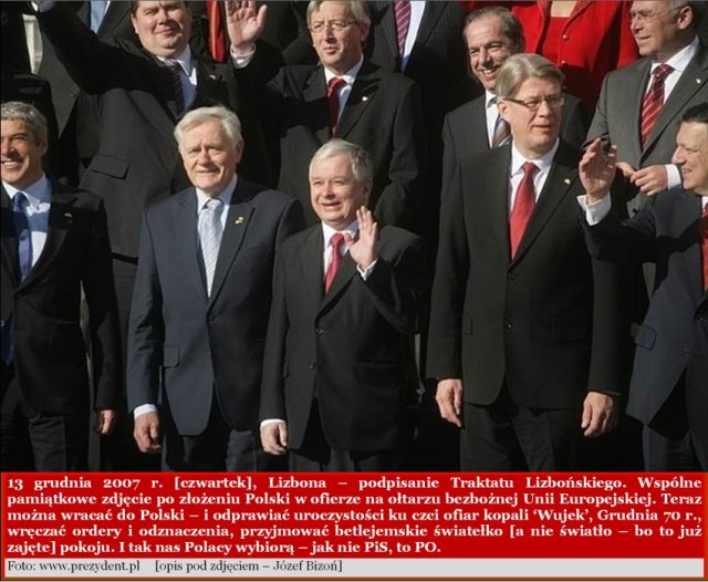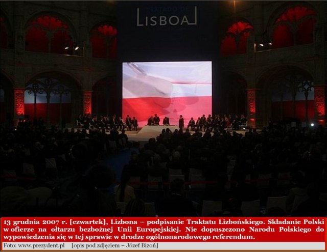 W tym kontekście [przy tej strategii] Unia Europejska stała się jedynie idealną przykrywką i idealnym narzędziem do realizacji tej głównej linii politycznej. Majątek narodowy Polaków został rozkradziony, struktury państwowe ubezwłasnowolnione [brak jakichkolwiek narządzi do przeciwdziałania], z Narodu Polskiego zrobiono nędzarzy i wypychany jest on z Polski za chlebem – a pozostałej reszcie kadzi się i mydli oczy wykorzystując do tego celu religię katolicką – no i koniecznie papieża Jana Pawła II.