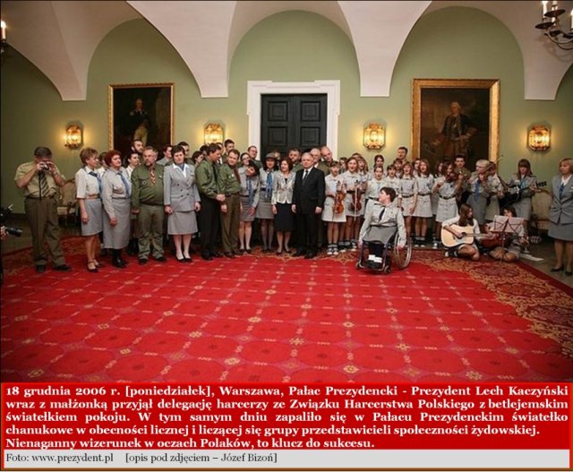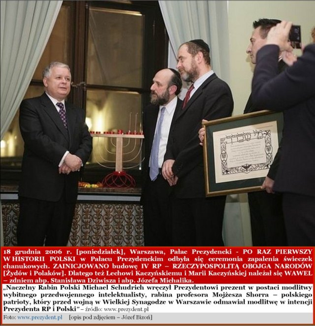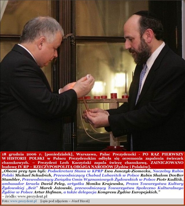 Po owocnych obradach, wykładach roku 2004 i 2005 w Fundacji Stefana Batorego George’a Sorosa – żydowskiego ‚filantropa’, po wymianie premiera Kazimierza Marcinkiewicza na premiera Jarosława Kaczyńskiego [14 lipca 2006 r.] i po owocnej wizycie prezydenta Lecha Kaczyńskiego w Izraelu w dniach 10-13 września 2006 r. [podczas której m.in. zapewniono stronie izraelskiej wgląd do archiwów IPN] nastał czas na stałe wprowadzenie do Pałacu Prezydenckiego żydowskiego święta Chanuki – no i przy tej okazji menory [jako świecznika pod świece chanukowe].
