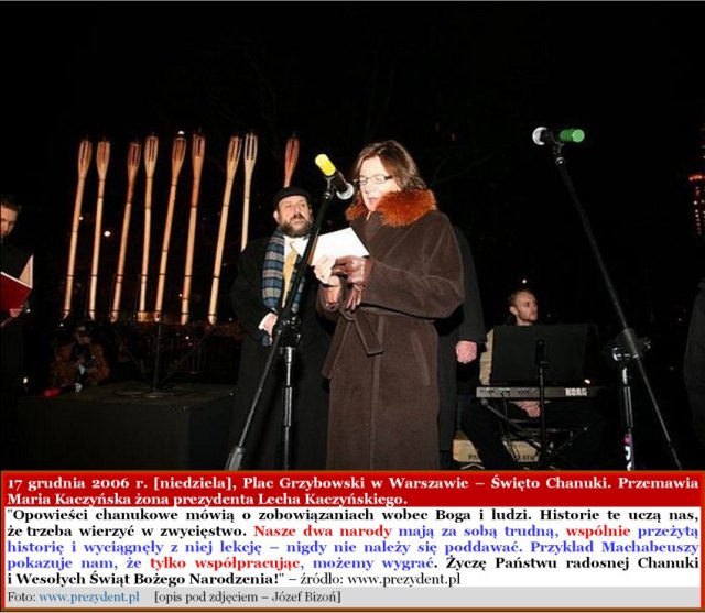 Po zachodzie słońca, o zmroku, na Plac Grzybowski w Warszawie udaje się małżonka prezydenta RP Maria Kaczyńska oraz prezydent Warszawy Hanna Gronkiewicz Waltz. Razem są tam PiS i PO przy świętowaniu Chanuki 2006.