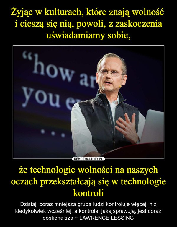 Bloomberg donosi że w Chinach już teraz po przekroczeniu ulicy w niedozwolonym miejscu system sam rozpoznaje twarz osoby, która dopuściła się wykroczenia i sam pobiera grzywnę z jej rachunku bankowego, wszystko automatycznie. Jeśli wejdziecie do takiego systemu, nie ma już wyjścia. Co więcej, jak tam wejdziecie, będziecie musieli udawać, że to lubicie, dlatego że udawanie zachwytu możliwościami systemu jest częścią gry. To kompletne zgwałcenie każdej ludzkiej osobowości. Spójrzcie na ten reportaż z Chin:
