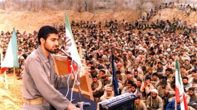Zdjęcie przedstawia młodego Soleimaniego przemawiającego do żołnierzy podczas narzuconej wojny irackiej w latach 80.