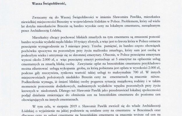 “Zwracamy się do Waszej Świątobliwości jako do ostatniej, najwyższej instancji w hierarchii władz Kościoła. (…) Mieszkańcy chcący pochować bliskich zmarłych na cmentarzu w Brzezinach, są zmuszeni ponosić bardzo wysokie wydatki rzędu 10 tys. zł, a więc jest to kwota, która w Polsce oznacza przeciętnie wynagrodzenie za trzy miesiące pracy” – czytamy w piśmie do papieża Franciszka.