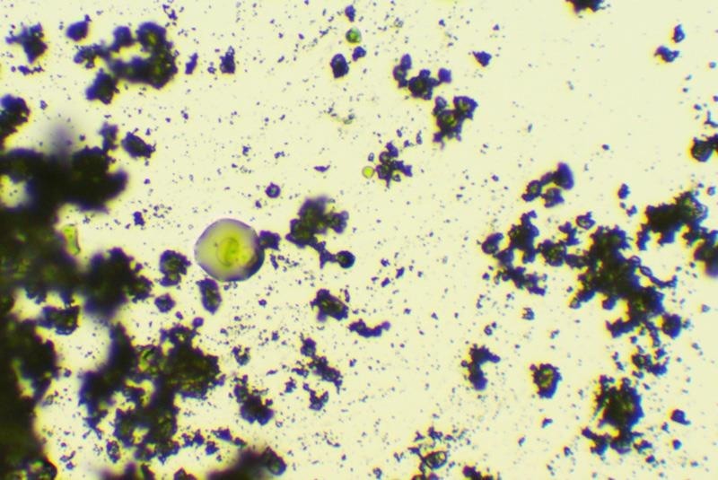 Rys. 3. pokruszona pastylka zawieszona w wodzie, pozostają nierozpuszczalne kryształy, obiektyw 10x