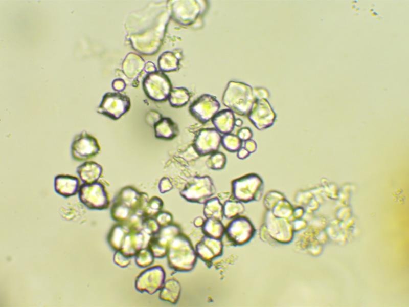 Zdjęcia mikroskopowe ujawniają niejednorodność substancji krystalicznych zawartych w tabletce Polfa Tarchomin, wskazując, że jest to mieszanina częściowo zmielonych kryształów. Występuje też pewna zawartość mikrokropelek cieczy.