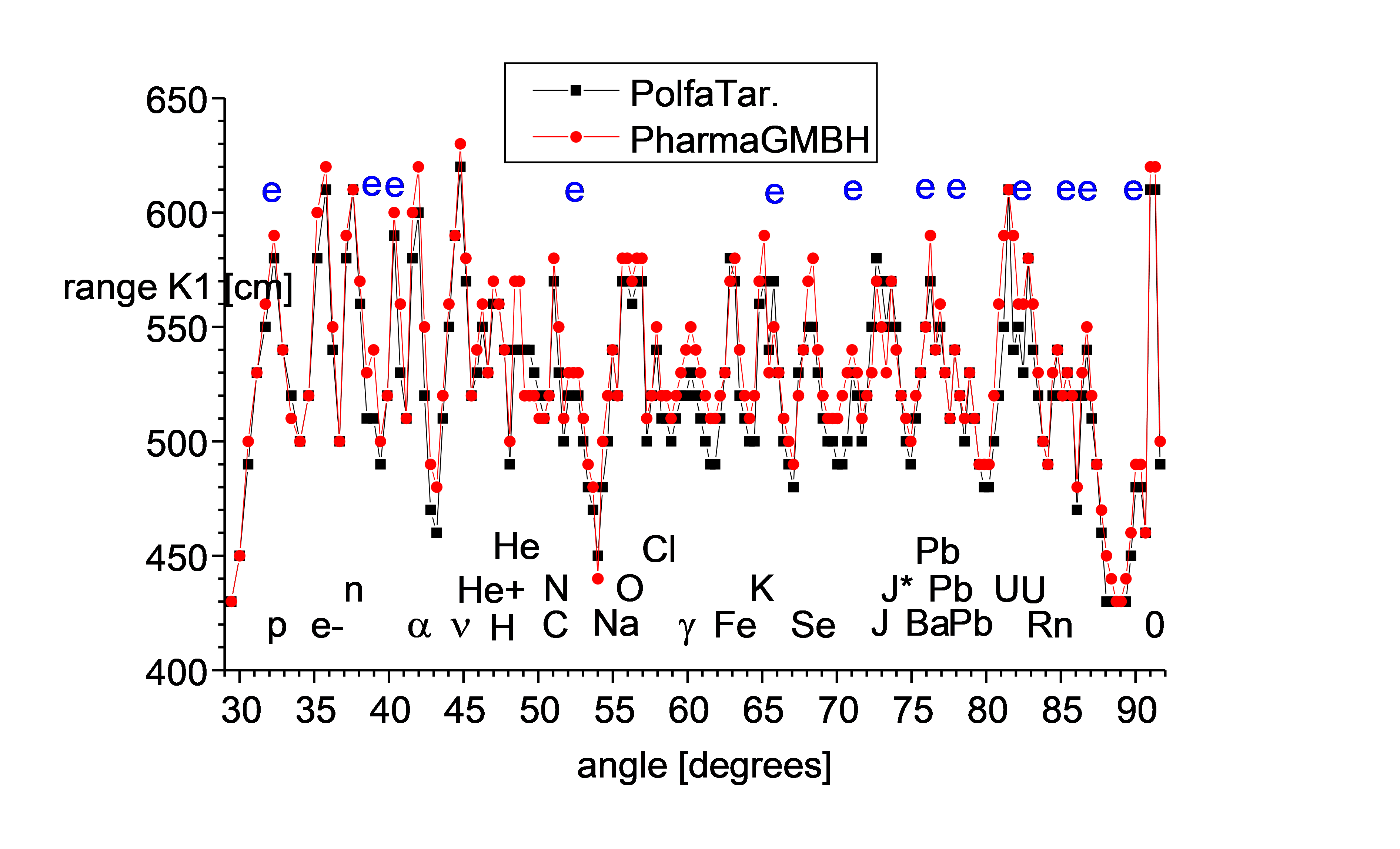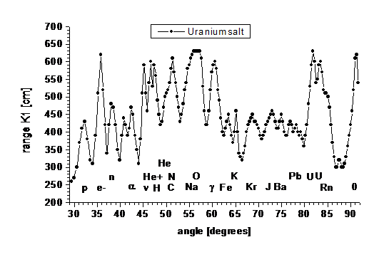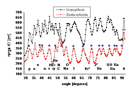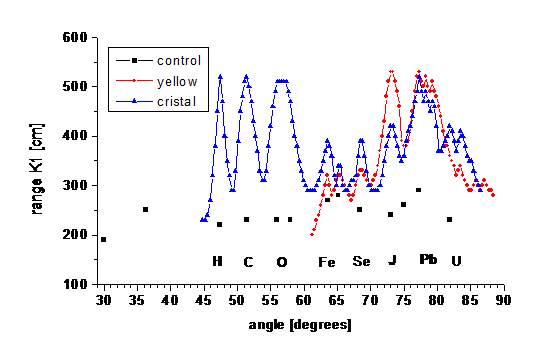 Oznaczenia: p – protony, e- – elektrony, n – neutrony, α – cząstki alfa, ν – neutrina, He+ – zjonizowana czasteczka helu, He – hel, H – wodór, C – węgiel, N – azot, Na -sód, O – tlen, Cl – chlor, γ – promieniowanie gamma w położeniu charakterystycznym dla atomów uranu, Fe – żelazo, K – potas, Se – selen, J – trwały izotop jodu, J* promieniotwórczy izotop jodu z rozpadu uranu, Ba – bar z rozpadu uranu, Pb trzy izotopy ołowiu, U -dwa izotopy uranu 234U i 238U, Rn – radon z rozpadu uranu, e – sygnał od orbitali potrójnego wiązania ugrupowania azydkowego, 0 – sygnał od nieodhylonego promienia zerowego. Oś odciętych – kąt wiązki padającej względem płaszczyzny łamiącej mierzony w stopniach; oś rzędnych – zasięg promieniowania Kategorii K1 z próbek na wyjściu spektroskopu mierzony w centymetrach.