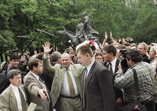 Ochrona eskortuje Giennadija Ziuganowa do samochodu po głosowaniu. Wybory prezydenta Federacji Rosyjskiej i mera Moskwy w 1996 roku. Zdjęcie: Vladimir Fedorenko/RIA Novosti