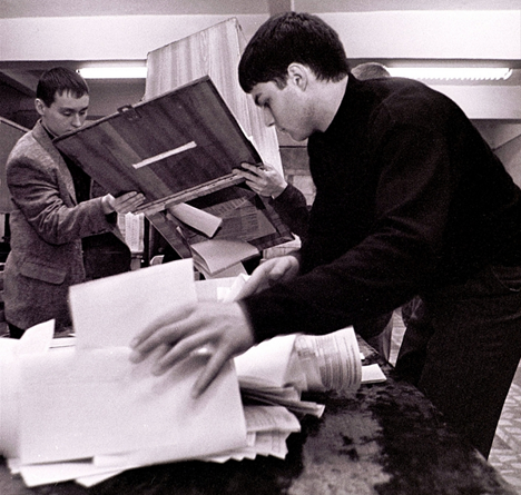 Członkowie komisji obwodowych rozpoczęli liczenie głosów oddanych przez wyborców na kandydata na prezydenta Rosji 26 marca 2000 r. Zdjęcie: Ivanov Vitaly/TASS