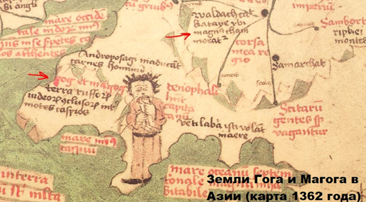 Na samej północy znanej wówczas części Azji istniała ogrodzona w górach dzielnica Gog i Magog, gdzie król mummer jeździ konno, z tyłu są dworzanie – brodaci, w typowych średniowiecznych rosyjskich kapeluszach. Na powiewającej fladze znajduje się uskrzydlone, ogoniaste stworzenie, oczywiście smok lub gryf (jak na fladze Tartarii). Po lewej stronie władcy coś jest napisane o “Gogu i Magogu”, ale trudno zrozumieć, co dokładnie. Król (najwyraźniej chan we własnej osobie) trzyma w ręku laskę ze złotą gałką, podobną do heraldycznej lilii. Khan i jego poddani mają europejskie włosy, blond włosy i brody.
