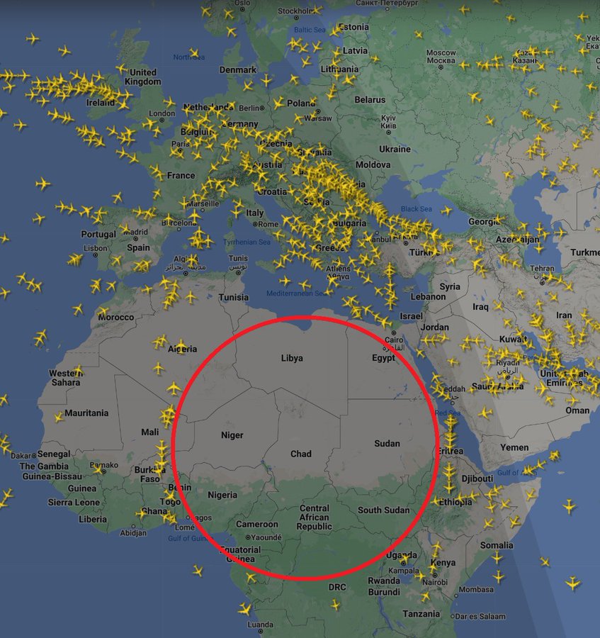 Oto radar lotów dla Afryki. W jakiś sposób wszystkie komercyjne linie lotnicze już wiedzą, że Niger jest teraz “strefą zakazu lotów”.