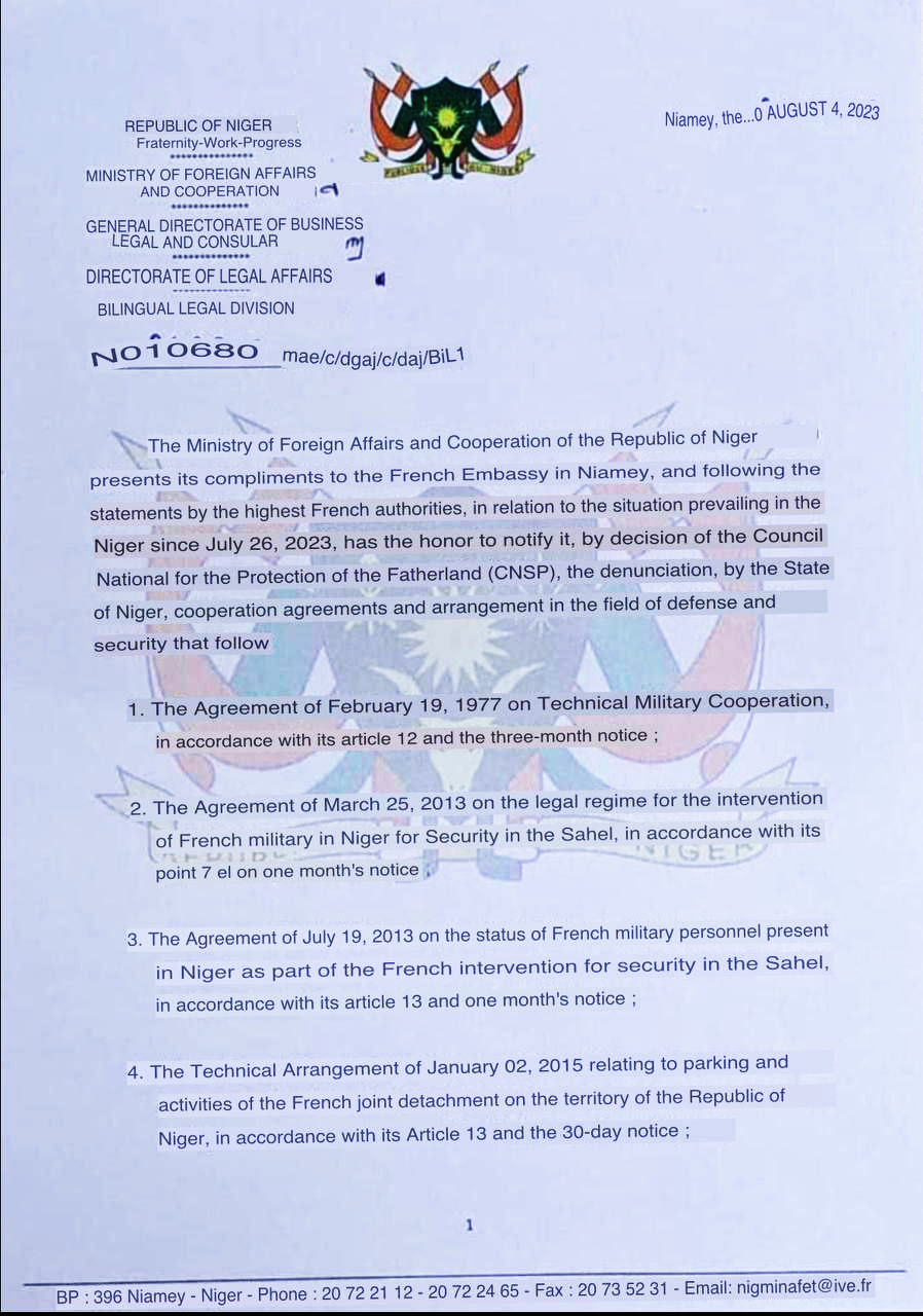 W ciągu kilku dni od przejęcia władzy wojsko Nigru WYPOWIEDZIAŁO “umowy o współpracy” z Francją, pozwalając francuskim wojskom na obecność w kraju. W szczególności Niger powołał się na 30-dniowe powiadomienie w ramach umów o współpracy, informujące Francuzów, że ich wojsko musi odejść.