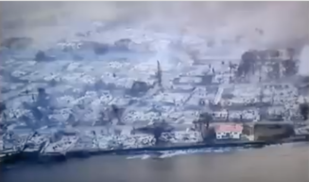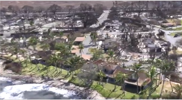 Proszę spojrzeć na blok domów nad oceanem w centrum zdjęcia, które zostały w jakiś sposób oszczędzone podczas prawdziwego holokaustu, który właśnie miał miejsce w Lahaina