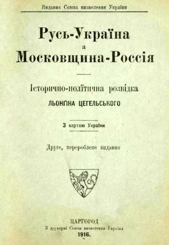 Broszura Longina Tsegelsky’ego “Ruś-Ukraina i region moskiewski-Rosja”. 1916 (wydane przez Związek Wyzwolenia Ukrainy)