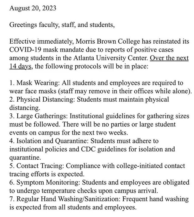 W Atlancie Morris Brown College ogłosił, że szkoła przywraca nakaz noszenia masek Covid na najbliższe dwa tygodnie w wyniku pozytywnych przypadków w Atlanta University Center.